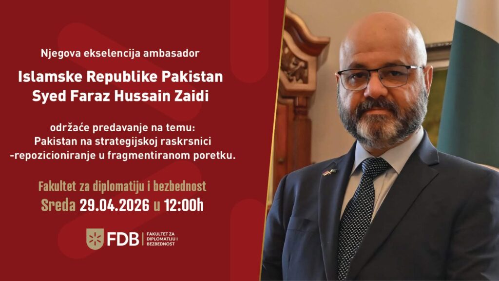 Dana 29. aprila u 12h na Fakultetu za diplomatiju i bezbednost Njegova ekselencija ambasador Islamske Republike Pakistan Syed Faraz Hussain Zaidi održaće predavanje na temu: